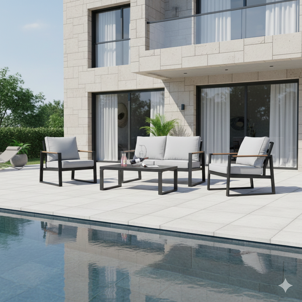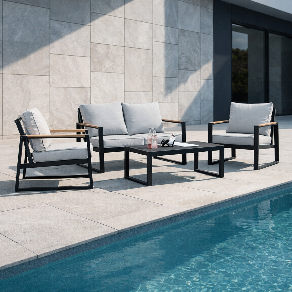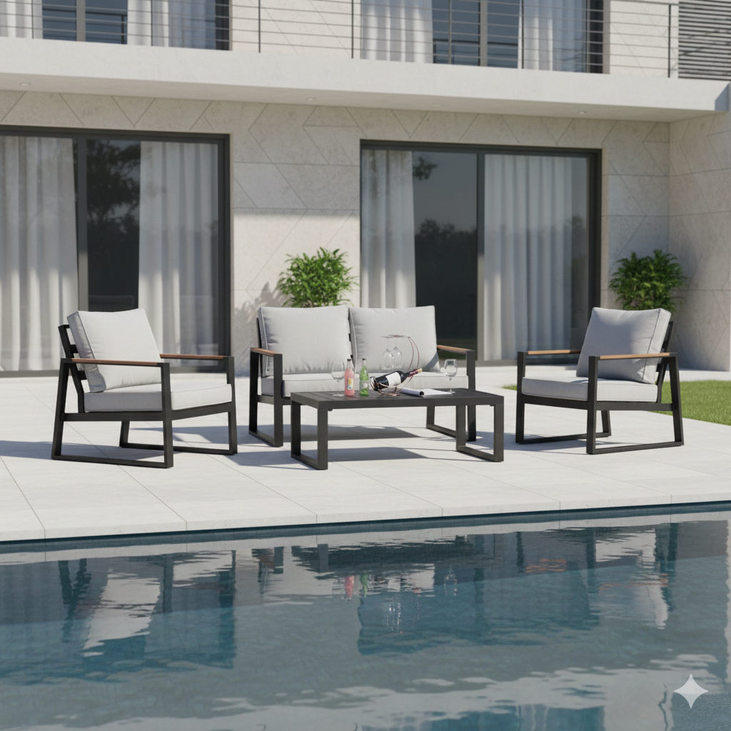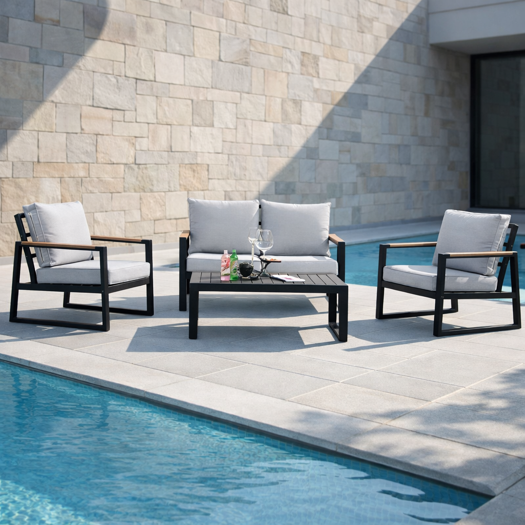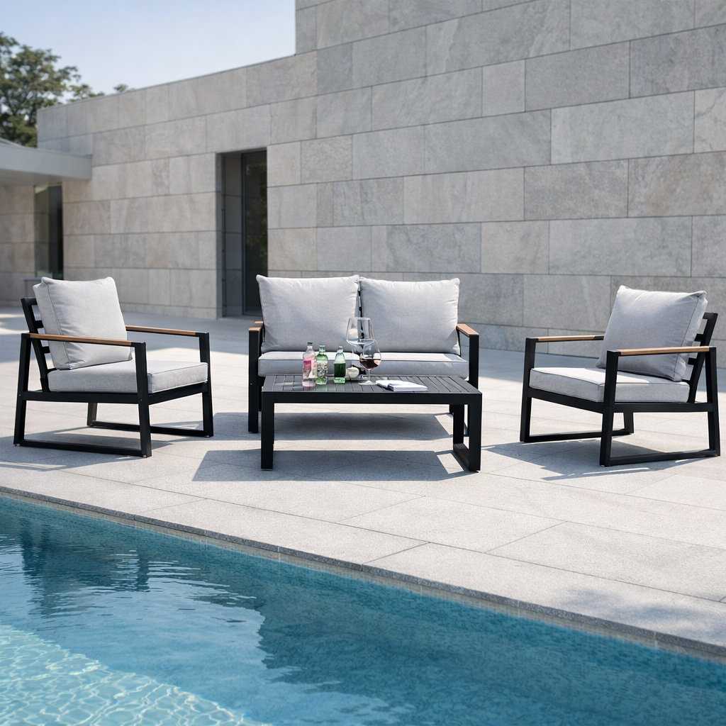 This modern outdoor seating set features a strong aluminium frame with a durable powder-coated finish, ensuring excellent resistance to rust and weathering. The armrests are designed with plastic wood accents, combining the natural look of wood with the durability and low maintenance of composite materials. Thick 10 cm waterproof cushions provide superior comfort and are ideal for outdoor use. With its clean lines and practical materials, this set is perfect for gardens, patios, balconies, and other outdoor relaxation areas.